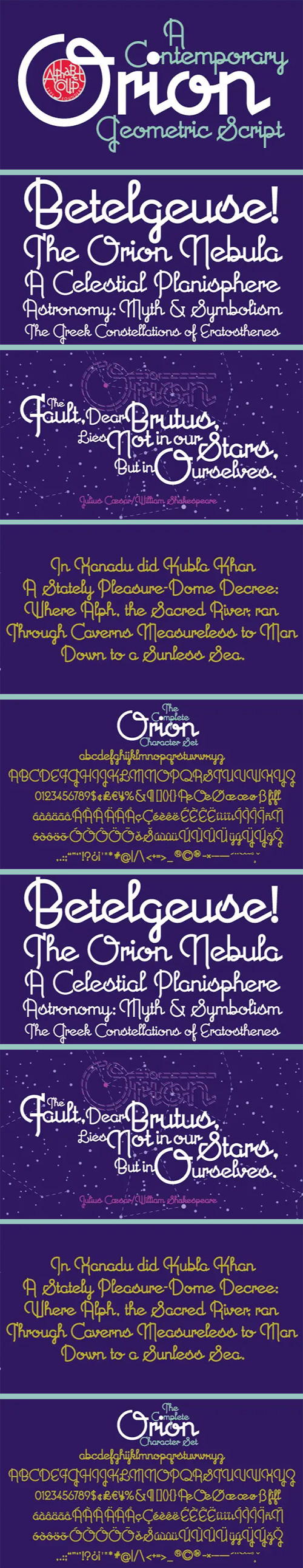 - A font where “each word that’s set approaches becoming its own logo” is how some have described this unique typeface. Originally inspired by an enamel sign he picked up at a Paris flea market, Michael Doret says that the seven letters contained in the sign were enough to suggest to him that here were letterforms put together in a way that he had never seen in a contemporary digital font. Always eager to create something a little out of the ordinary, he took up the challenge to flesh out the forms into a complete font. Orion can be defined as a geometric, connecting script that is at once contemporary, yet classic and timeless.