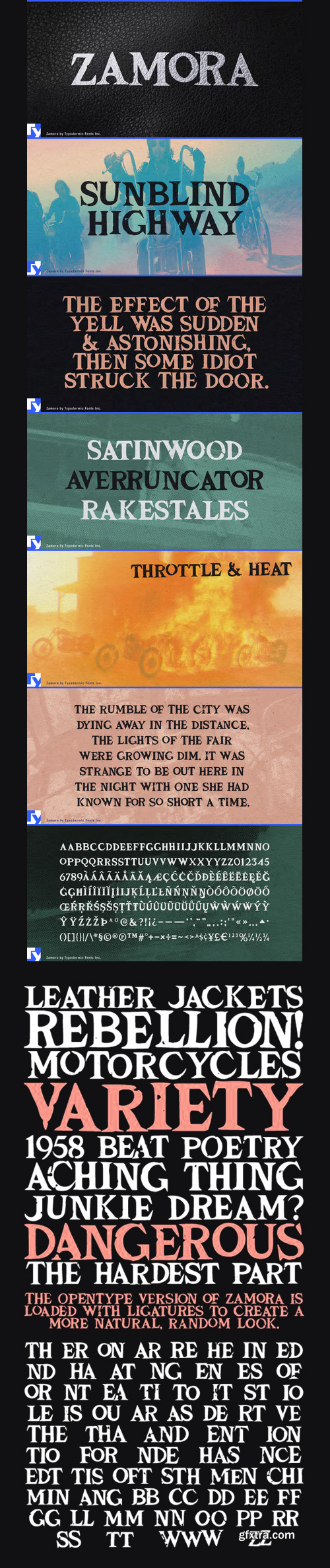 Zamora comes loaded with a variety of ligatures that give text a natural, random look.