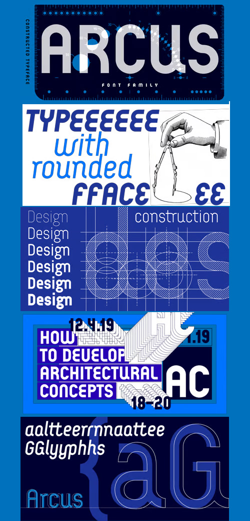 - Arcus OpenType is a geometrically constructed font. The grounding principle is the round curve. The homogeneous character of this font is guaranteed by using this principle not only in drawings of particular letters but in the shaping of diacritical signs, too. The scope of the typeface weight is from Extra Light to Extra Bold while the complete font family includes 6 weights and their respective, well turned italics. This font contains a wide range of alternative signs, small capitals, lining and oldstyle numerals, fractions, superiors, inferiors, ligatures and discretionary ligatures; all this is within the frame of OpenType functions. This font type is not made for the typography of extensive texts. Best it can be used for headline display typeface or in creating logotypes and corporate identities.