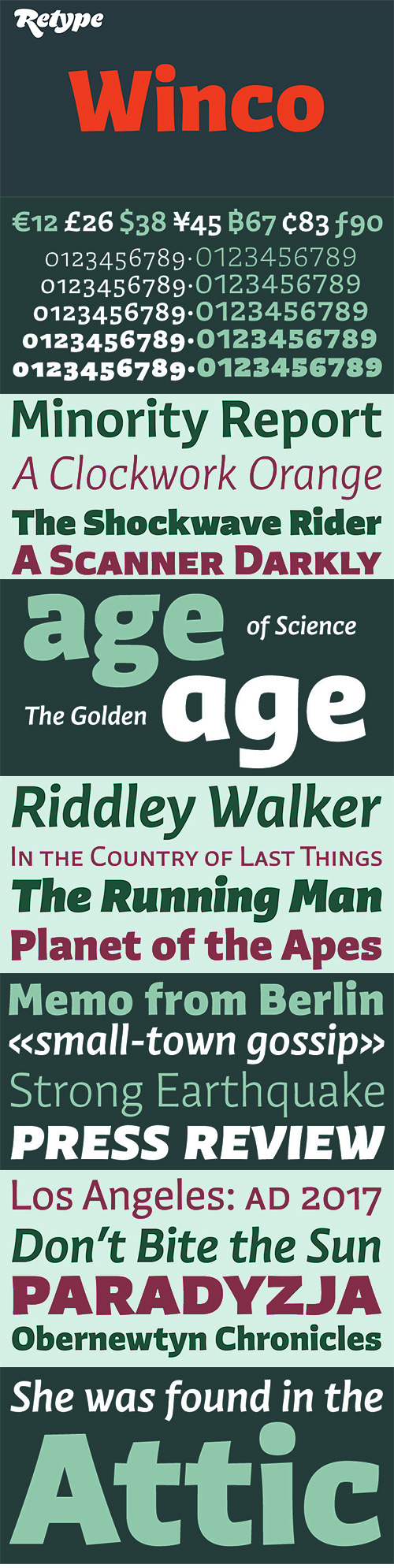 - Winco family can be labelled a humanist sans-serif, but in spirit it is more closely related to that rather rare typeface category called ‘glyphic’ or ‘incise’. While conceiving Winco, Ramiro Espinoza studied the work of the masters of postwar book cover design: Helmut Salden, Boudewijn Ietswaart, Berthold Wolpe; among others. He also looked into German and Czech traditions of expressive printing types that had such a strong presence in the earliest decades of the 20th century. Having established a stylistic framework, Espinoza designed the typeface from scratch. This allowed him to create an original, typographically consistent and versatile family in five weights, from Light to Ultra Black. The process has resulted in a typeface that successfully combines the high legibility and seriousness of a text face with the expressiveness, dynamism and subtle irreverence of the original hand-rendered alphabets. Winco is a versatile family whose extreme weights – Light, Black and Ultra Black – make for striking headlines, while the middle weights work well in both display and text settings. Produced as CFF OpenType fonts, all weights come with small caps and multiple numeral sets, including superscript, subscript and fractions, alternate glyphs and ligatures, making Winco a typographically sophisticated family suitable for a wide range of editorial and corporate work.