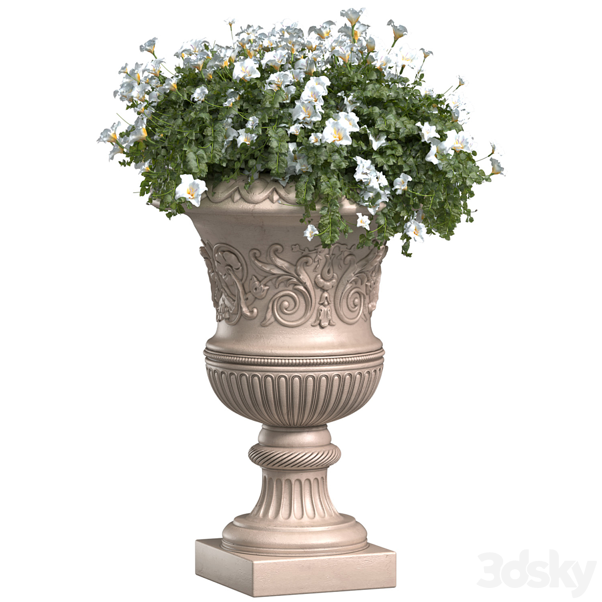 White Petunia flower in a classic flowerpot for decorating the facade.Petunia Plant Flowerpot