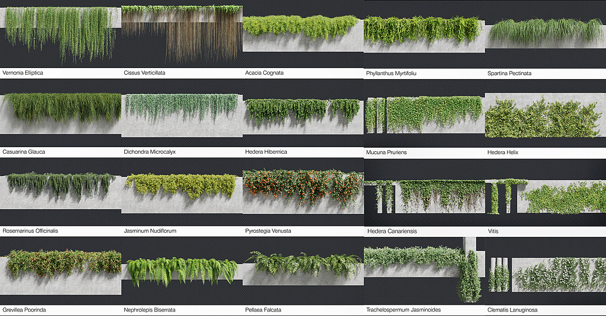 Meet Creeper Scapes. This is a first 3D models pack from TerraScape. A complete production solution for any kind of environmental artworks from beautiful landscapes to post-apocalyptic sceneries. The library is ready to go with 21 species of carefully detailed creeper and vine plants which consists of 437 models in total, with up to 45 variations for a each model. Diversity of the plants is a big deal so you can enjoy creating nature scenes by using them to achieve natural, non-repeatable and realistic results. The flexibility of the models lies in their fragmented structure. Actually you get plant patches, so they have possibility to be assigned non-limited forms unlike some models with single mesh that are enough "rigid" to be quickly manipulated. In nature leaves gradually lose chlorophyll during the growing seasons. That's why they become more yellow and yellow. To control randomization of the leaves you won't need complex, gradient-material adjustments or vertex color mambo-jumbo anymore! Instead of there a single map used as a mixer to produce color variations, giving you convenient and full control over the materials. The entire pack uses Principled BSDF materials for it's all components and prepared for both cycles and eevee. It remains only to switch to the desired engine. Please watch this video tutorial to learn how to distribute plants along given paths: