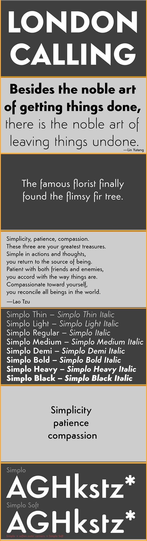 - Simplo is a geometric sans serif typeface, built in sixteen styles. It is a tribute to the 1930s typeface Semplicita, designed by Nebiolo’s Alessandro Butti. Although many details of Simplo differ from Semplicita, it preserves the spirit of the original. Simplo is ideal for use in display sizes. It is also quite legible in text, and is well suited for graphic design and corporate identity design. Simplo has sixteen styles, extensive language support, eight different kinds of figures, sophisticated OpenType features — so it’s ready for advanced typographic projects. The most notable characteristics of this typeface are the t and the f. The t is the culmination of simplicity: a vertical line with just a simple right-side crossbar. The f also has just a right-side crossbar, and is really tall: it reaches both the highest and lowest vertical position of the typeface. The top of the distinctive s, is much narrower than its bottom. The a, b, d, g, p, q, and u are spurless, and show a family resemblance with Hans Reichel’s 1990s typeface Dax. However, these letters are rounder and more geometric than Dax’s counterparts, because of Dax’s higher x-height and narrower design. In Paul Shaw’s Imprint article about typefaces that have been overlooked and/or underappreciated, “Overlooked Typefaces”, he concluded his discussion of Semplicita as follows: “These idiosyncrasies suggest that Semplicita might find a warm reception today, given the current love affair with Gotham, Neutraface and Proxima—and the resurgence of ITC Avant-Garde Gothic.”