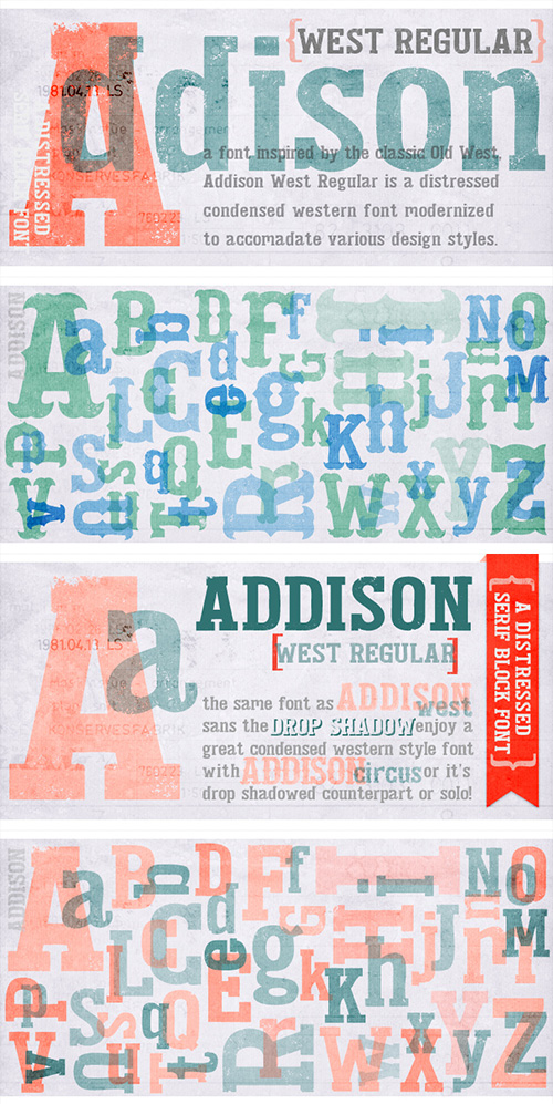 - Addison is a typeface that brings together modern western styles with a rustic texture. Between Addison West, with thick block serifs, and Circus, a more decorative face, the two would bring an authentic and unique style to any artwork. The bold faces make a stand and standout for any design concept.