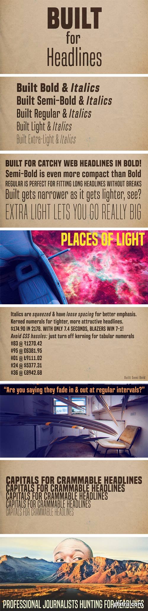 - Built has one job: making solid, compact headlines onscreen. Designed with trust and neutrality in mind, Built’s wraparound shapes speak your headlines in newsy voice. Subtle curls conjure a feeling of a different news era while not coming across as particularly old-fashioned. The Built family comes in five weights, from extra-light to bold. But not your typical thin to fat linear range. When you’re designing for the screen, there are practical limitations with light fonts. These days, with variable resolutions and screen sizes, going lighter means going bigger. Much bigger. And it’s no fun if your words end up falling off the line. Built actually gets narrower as it gets lighter. Now you can can scale way up and still have room to spare. Set attractive, oversized page titles without worrying if the words will fit. Tabular (monospace) numerals are handy when you have lists of numbers to align. In headlines, tabular numerals don’t look so hot–and they waste space. Lots of fonts let you choose between proportional and tabular numerals. OpenType technology lets designers access different types of numerals, but implementing OpenType features on the web isn’t fun–it’s not always practical. Built has a simple solution: if you turn off hinting, numerals, monetary symbols and most math symbols line up. Easy. Built has fractions, primes, numeric ordinals, compact accents, the Indian rupee and the Turkish lira. As Built loses weight, its asterisk sprouts more legs, retaining it’s presence even in Extra-Light. The italics are squeezed thin and loosened up on the sides, creating cool emphasis that’s more than just a slant. Built is available in Extra-Light, Light, Regular, Semi-Bold and Bold plus italics.
