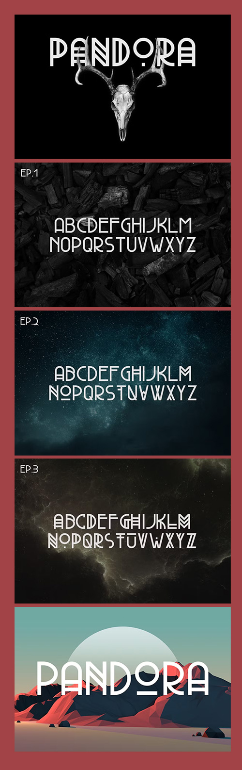 - Pandora is a weird typeface, it was inspired by a lot of things, some album covers and American Horror Story among some of the inspiration. It consists of 3 different fonts. Ep.1 is the simple version of the font, Ep.2 has more geometric elements and is more abstract and Ep.3 is just out of this world. The typeface only includes Uppercase letters and numerals.