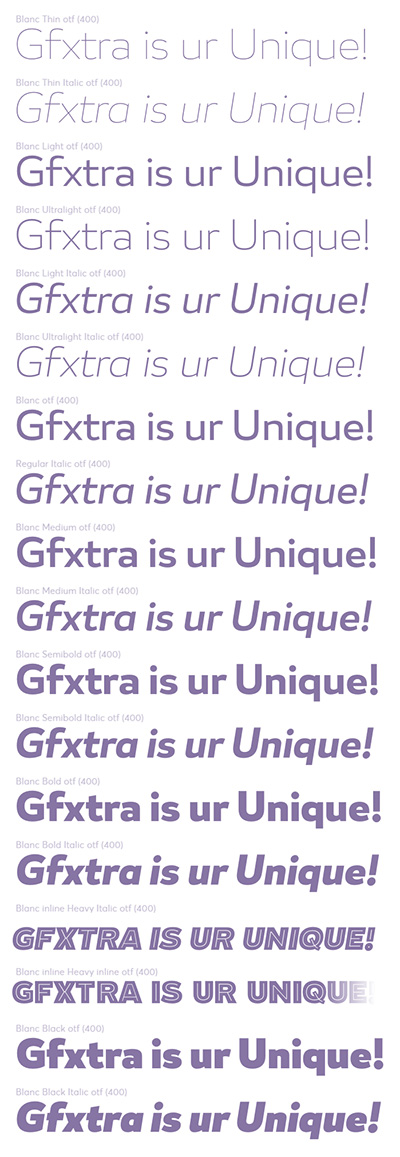 - Blanc is a functional humanist sans typeface with a marked personality and great style that make it ideal for use in headlines. Blanc is an ode to neutrality: a geometric face characterised by low contrast between thick and thin strokes with calligraphic features that emphasise specific glyphs. Blanc comes with 8 weights and an inline version that make it well-suited for headings and subheadings, corporate designs, advertising, publishing, etc.