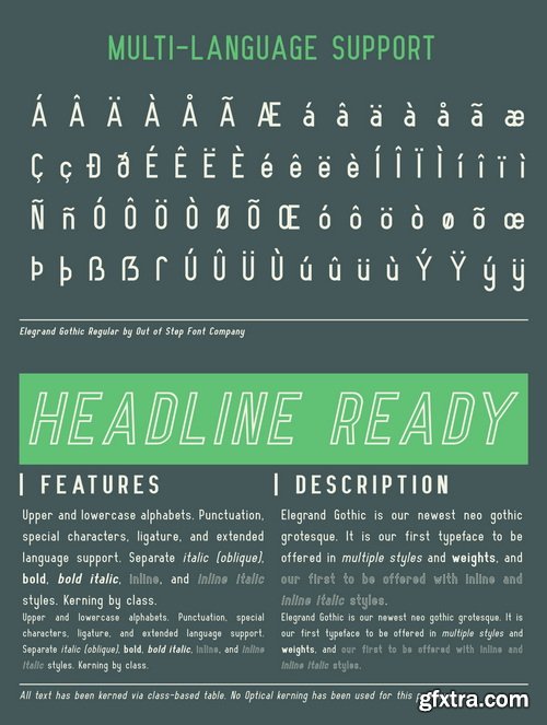- All glyphs in the are provided in bold, italic (oblique), bold-italic, inline, and inline italic variations. Elegrand Gothic has been expertly kerned for balanced text presentation. A wide range of options and styles ensure Elegrand Gothic fits in all your projects.