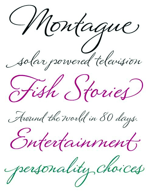 - Montague Script takes its name from a small hilltown of western Massachusetts rich in culture and history. I lived in this beloved community for a number of years and it’s where I first began my study of calligraphy and lettering. While most brush scripts take their cue from mid-twentieth century samples, Montague Script is a fresh, contemporary alternative. It comes directly from lettering written with a #3 sable brush on smooth vellum and is digitized with the same sensibility a lettering artist writes with. Montague reflects a dynamic interplay between form and rhythm not usually associated with type. Words suggest a baseline, yet are not bound by it. Beginnings, endings, alternates and ligatures come in as needed while you type. Many more alternates are available in the glyph palette of most current graphic software. Exuberant swash versions of upper and lowercase letters, as well as ligatures can be accessed through both the type and glyph palettes. Montague Script is a natural for advertising, point of purchase displays, packaging and logo design, cards, invitations, journals and much more. You will be delighted at how well it can dress up a project and how easily it sets.
