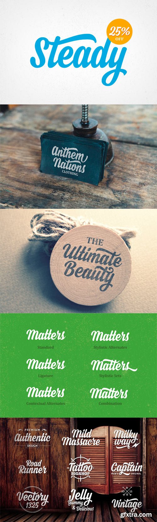 - Steady is a script typeface with personality. It was designed as a display typeface that contains 315 glyphs in total and 126 alternative characters to improve your design. You can use it as a logo, badge, insignia, packaging, headline, poster, t-shirt/apparel, greeting card, and wedding invitation. The flowing characters are ideal to make an attractive messages, mix and match Steady with a bunch of alternative characters to fit your project. The alternative characters in this font were divided into several OpenType features such as Contextual Alternates, Stylistic Alternates, Stylistic Sets, and Ligature. The OpenType features can be accessed by using OpenType savvy program such as Adobe Illustrator and Adobe InDesign.