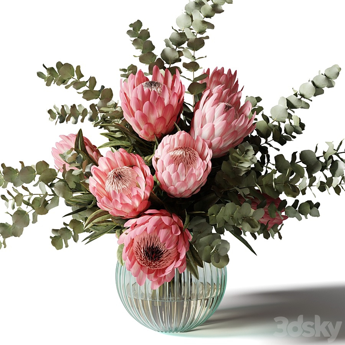 Bouquet with pink proteas and eucalyptus in a ribbed glass vase