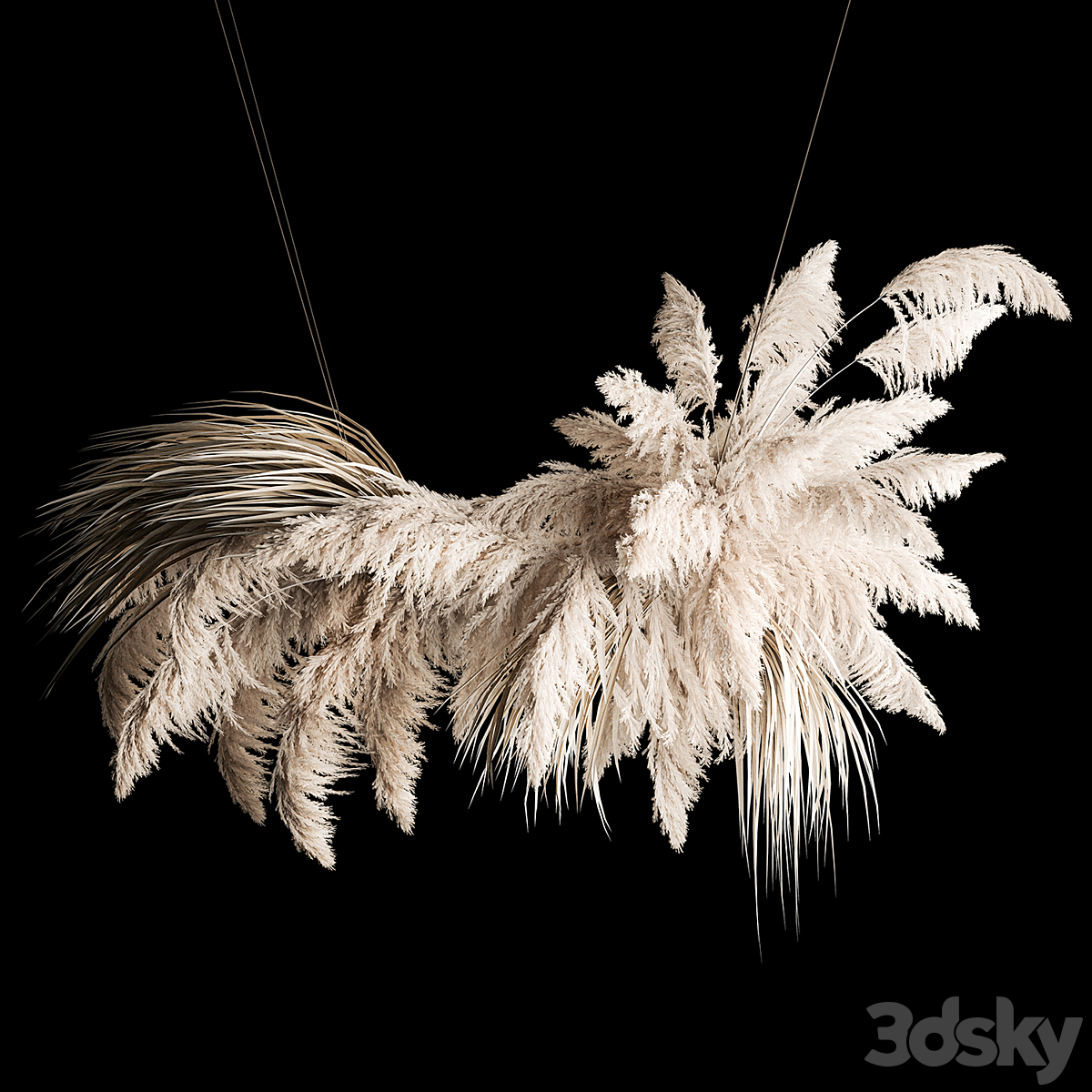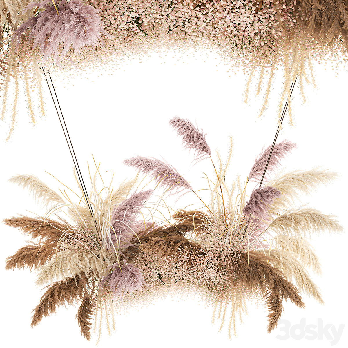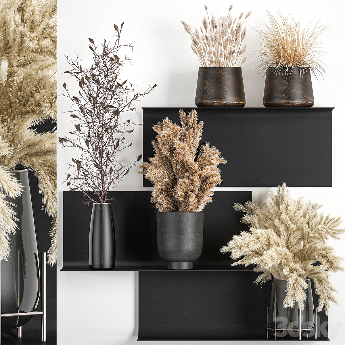 A set of bouquets of dried flowers in vases on a black metal shelf made of Pampas branches, reeds. 119