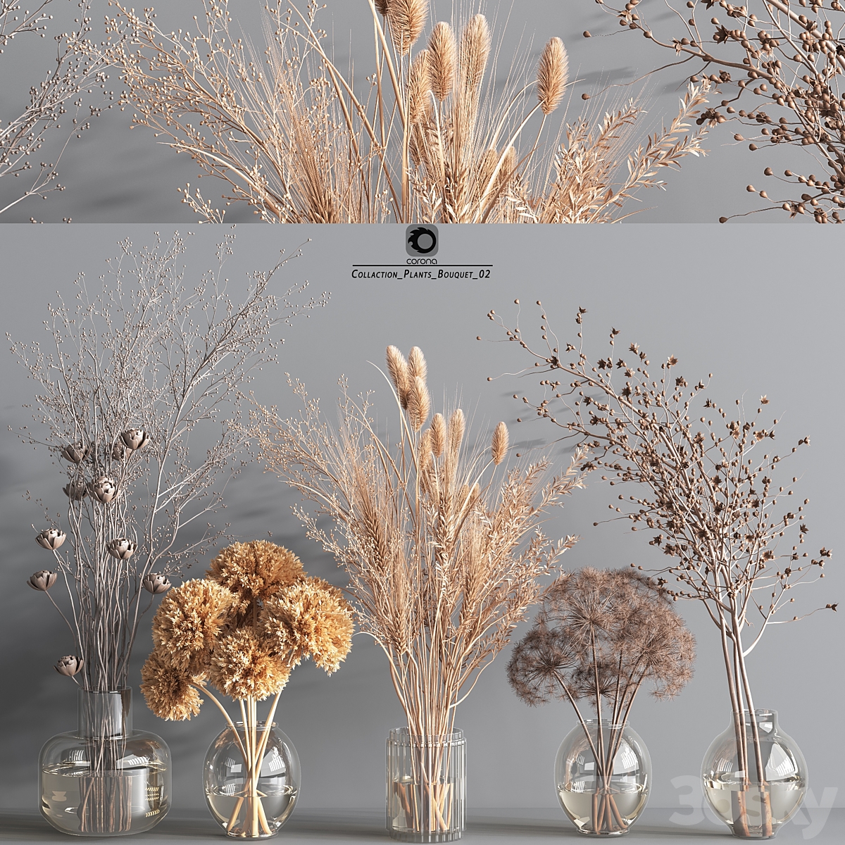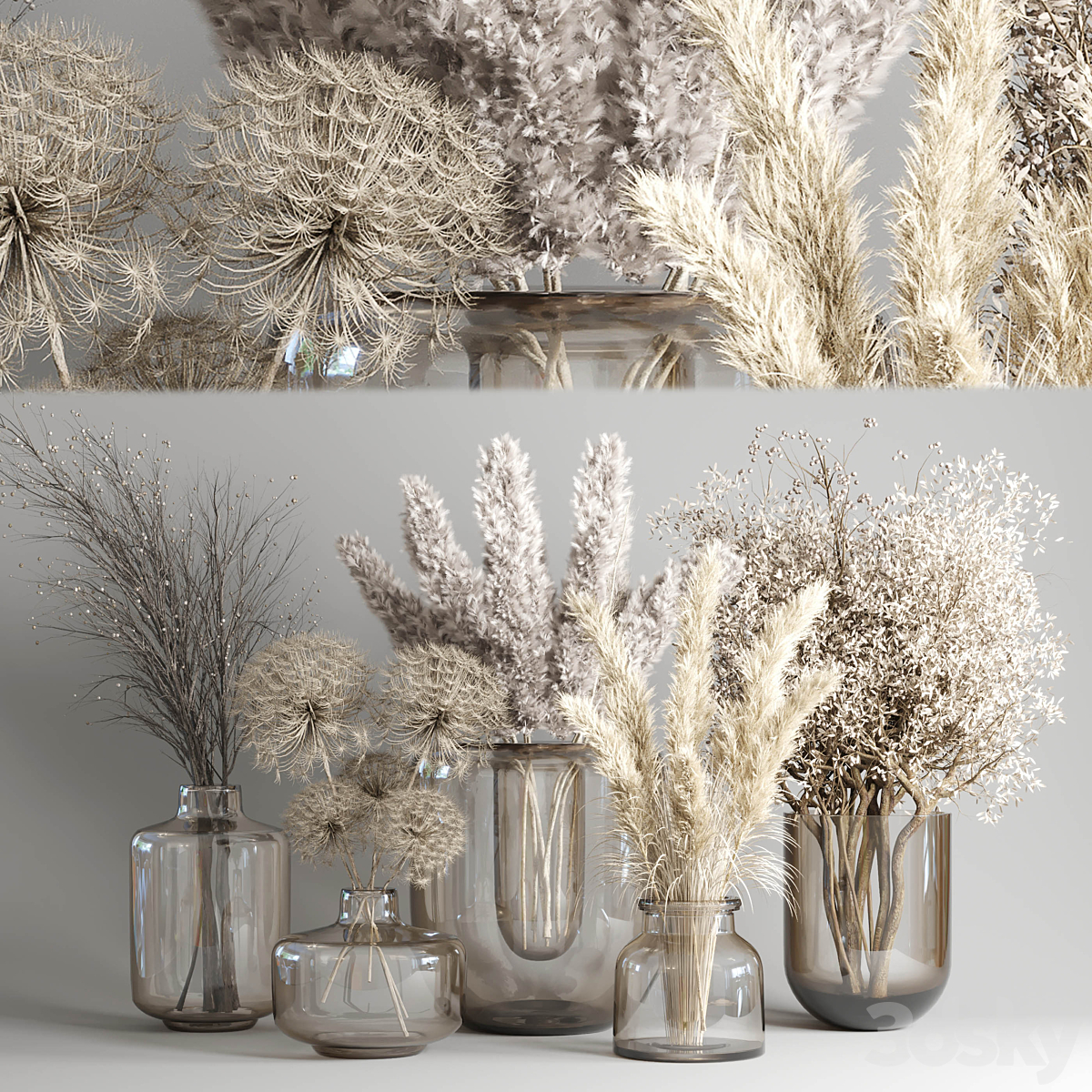 Set of 5 bouquets of dried flowers in glass vases