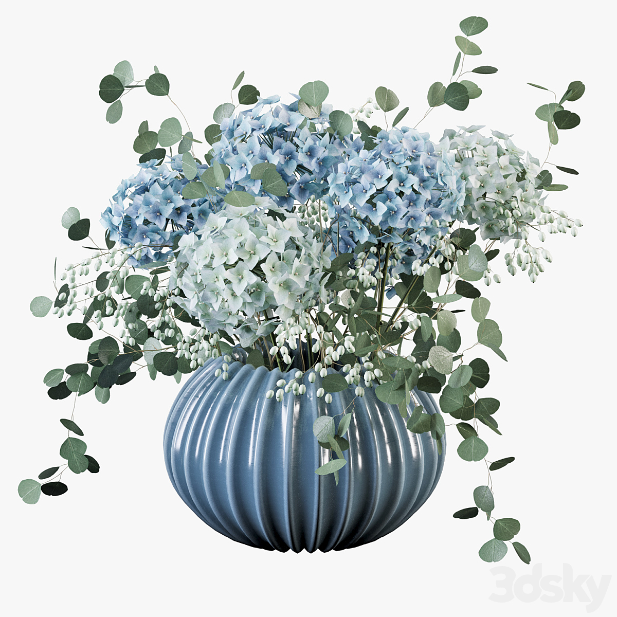 Green Hydrangeas with Eucaliptus baby blue in Bubble vase
