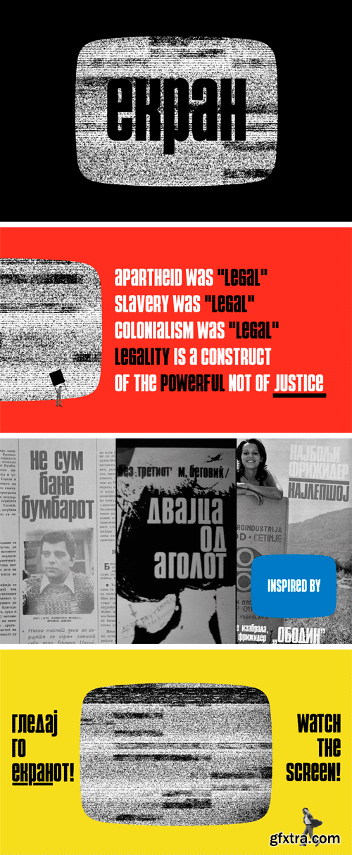 Ekran - display font is a created by Nebojsa Gelevski - Bane. The Ekran font is inspired by headline fonts used in Ekran weekly magazine from Macedonia in 1970s. English translation of 'Ekran' is 'Screen'. This minimalistic and classy all-caps sans-serif typeface is perfect for making gorgeous logos & titles.