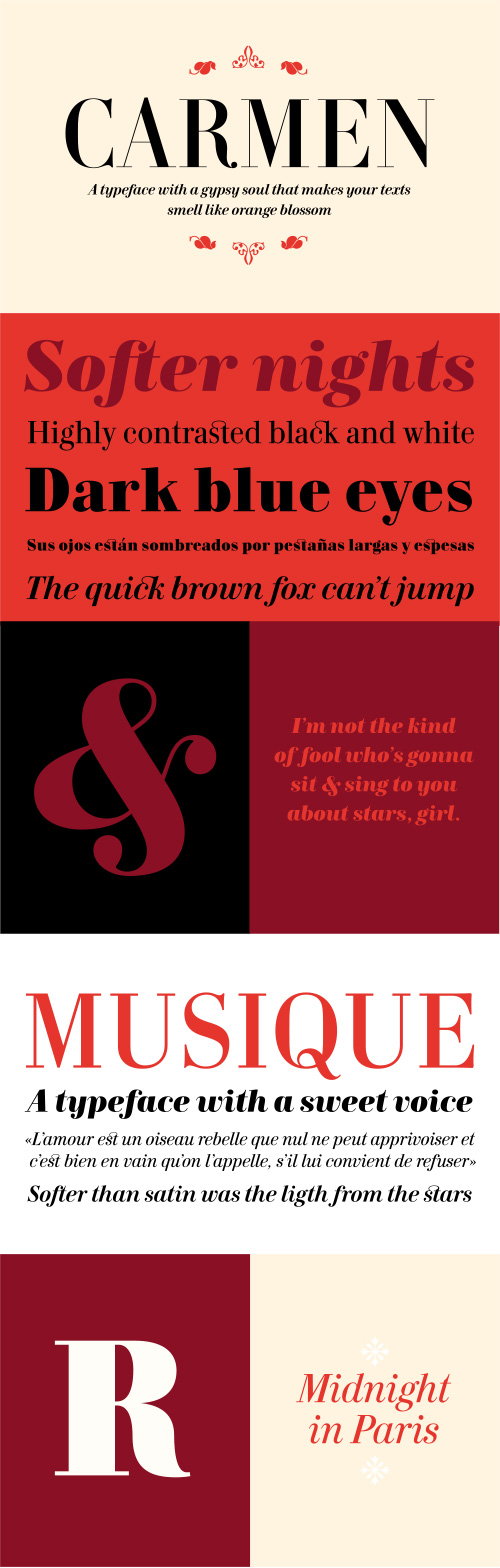 - It was first designed as a commissioned work for a new revised edition of the famous novel “Carmen”. The typeface has some sort of Latin Spanish-French flavor that leads us into the early nineteenth century but with a contemporary view. It works fine for both reading text and headlines. Its Italics provide a nice rythm and dinamism within the text. The shapes of letters show a taste for elegance and extravaganza at the same time.
