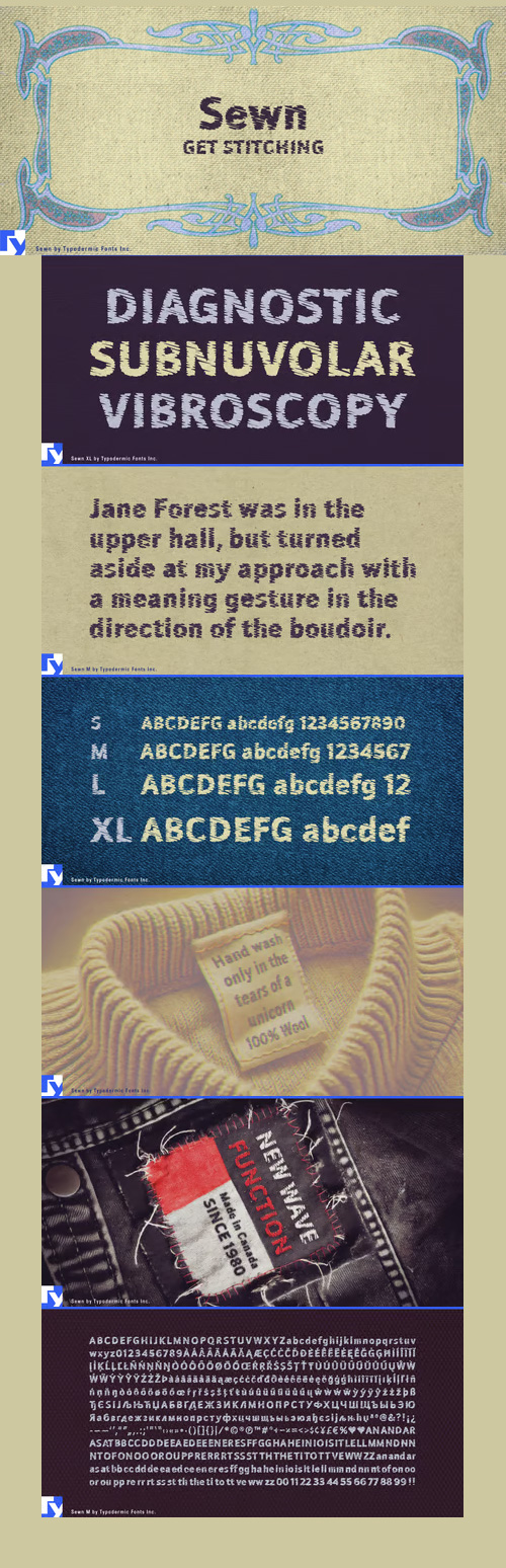 - Sewn is a mechanically embroidered font in four sizes: small, medium, large & extra-large. Smaller sizes have heavier thread and less stitches. The OpenType format feautures autoligs which automatically swap common letter pairs with variations to create a more realistic, less repetetive effect.
