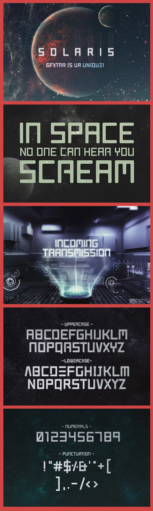 Solaris is a futuristic font with alternate letters, numericals and punctuation.