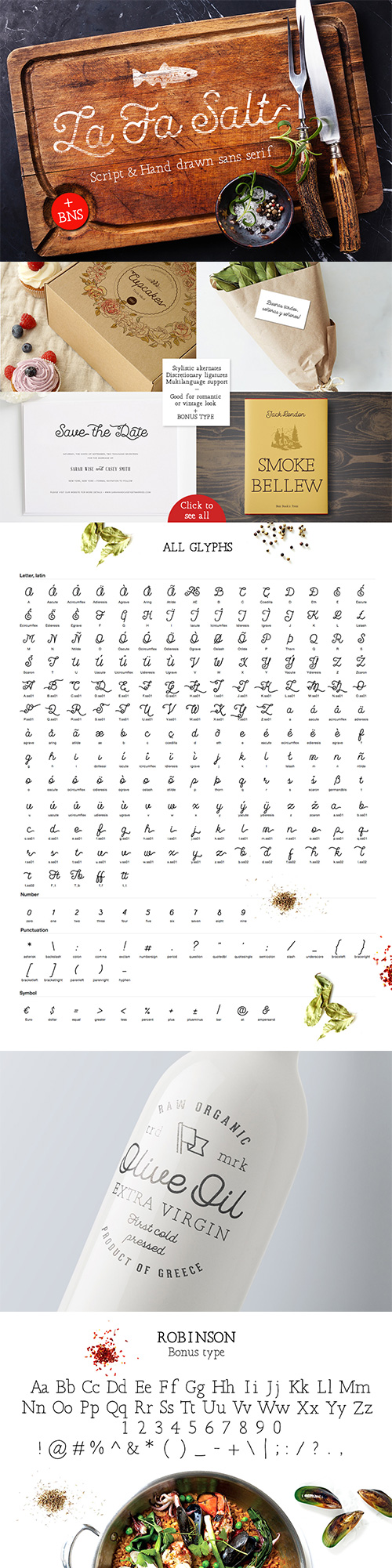 - I want to show you my hardworking week product - La Fa Salt cursive script. There are also some interesting alternates ending and other glyphs, discretionary ligatures, includes a full set of capital and lowercase letters (Also with Romantic stylistic alternate), as well as multi-language support, numerals, and punctuation.