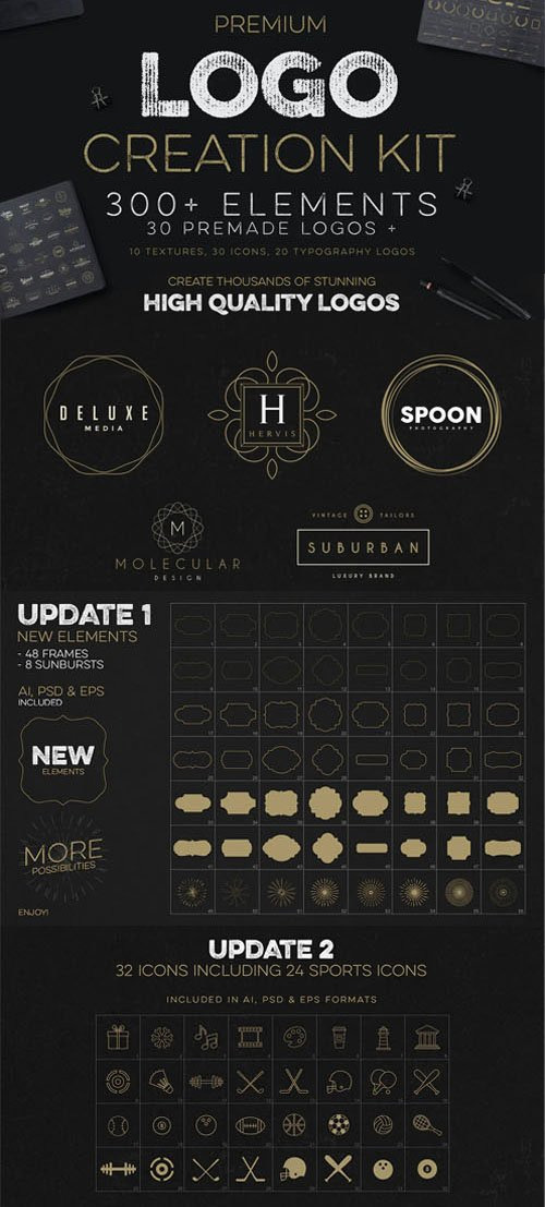 - All elements are included as vector shapes and are fully editable and resizable. There are 300 elements, 10 textures and 40 suggested fonts in this bundle 30 premade logos & 20 typography logos included. Imagine the possibilities! Create thousands of stunning high quality logos either you are a Illustrator or Photoshop user.