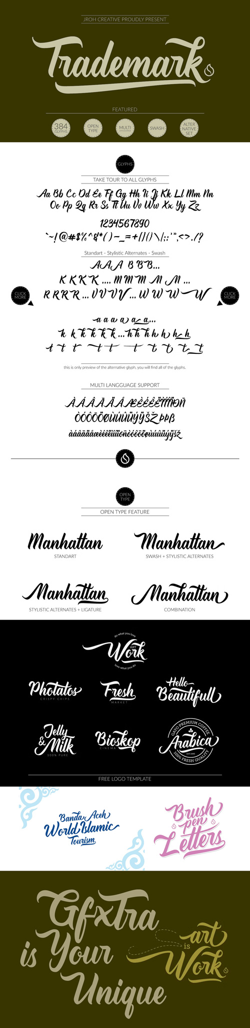 - Hi....let me introduce the TradeMark, this font was created to help you designing brand of yours own or your client, and you also can use it for designing all of the graphic stuff such as badge, sign, packaging, headline, T-shirt/apparel, Poster, etc. Confidence, dynamic, readable, etc. TradeMark containing 384 Glyphs with 202 alternative characters to improve your design.