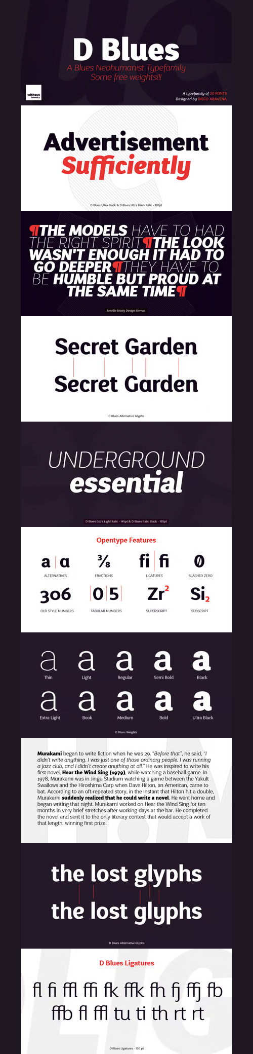 - D Blues its a sans serif typefamily of 9 weights plus matching italics. It is inspired by the neo humanist typefaces with a mix of 20st grotesque sans typeface. D Blues serve very well in web & print design areas, body text, excellent web-font legibility etc…D Blues is equipped with a complete set of opentype features including alternative glyphs, fractions, ligatures and many more. It is perfectly suited for highlighting lettering, magazines, web, interaction design, advertising & logotypes.
