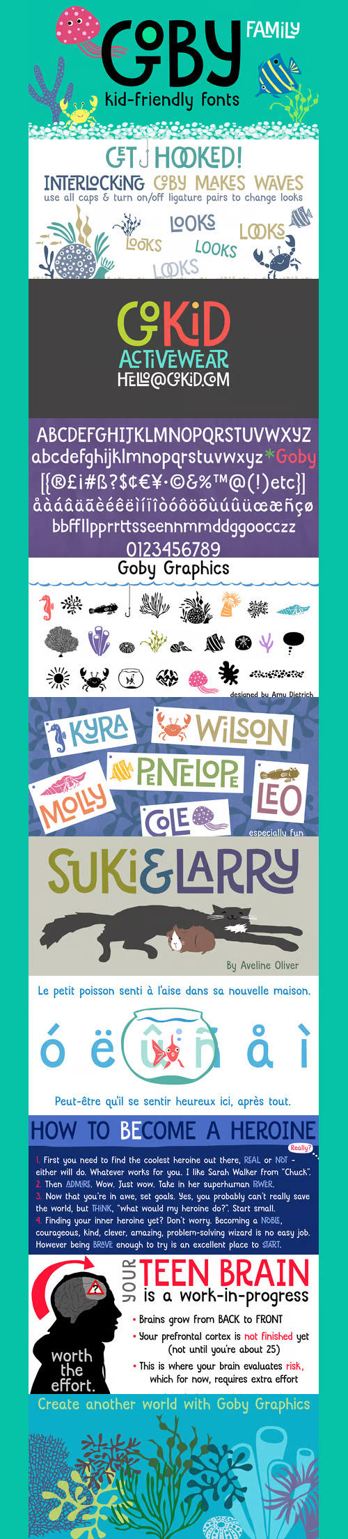 - Goby has several distinct personalities, and can definitely help you make some waves. Lower case Goby is sweet, lively, easy to read, bold, and always friendly. Goby also works great in all-caps, and if you turn on discretionary ligatures, discover a huge stash of funky two and three-letter ligatures that can make ordinary words look extraordinary. The Goby font family also includes Goby Graphics, an ocean-y collection of illustrations by Amy Dietrich. If you need some artful seaweed, a head of coral, a seahorse, or maybe a smiling hermit crab, the unique images of Goby Graphics will work swimmingly.