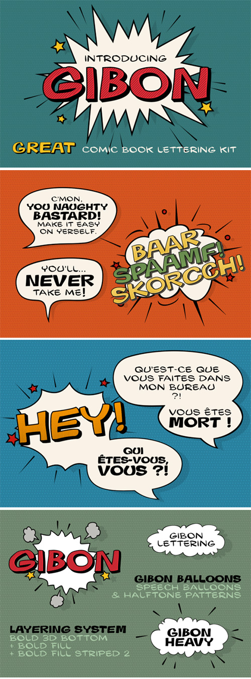 - Gibon draws inspiration from the fascinating comic book univers inhabited not only by many legendary superheroes, monsters and superbadass antiheroes, but also by its own legendary typefaces. Every cartoonist and hand letterer needs a pencil, a T-square and on and on. For digital lettering Gibon is an option. This handy toolkit helps you easily letter your comic strips, but even if you have nothing to do with cartooning, this bundle can simply add some comic book feel to your design or make some noise with layered sound effects.