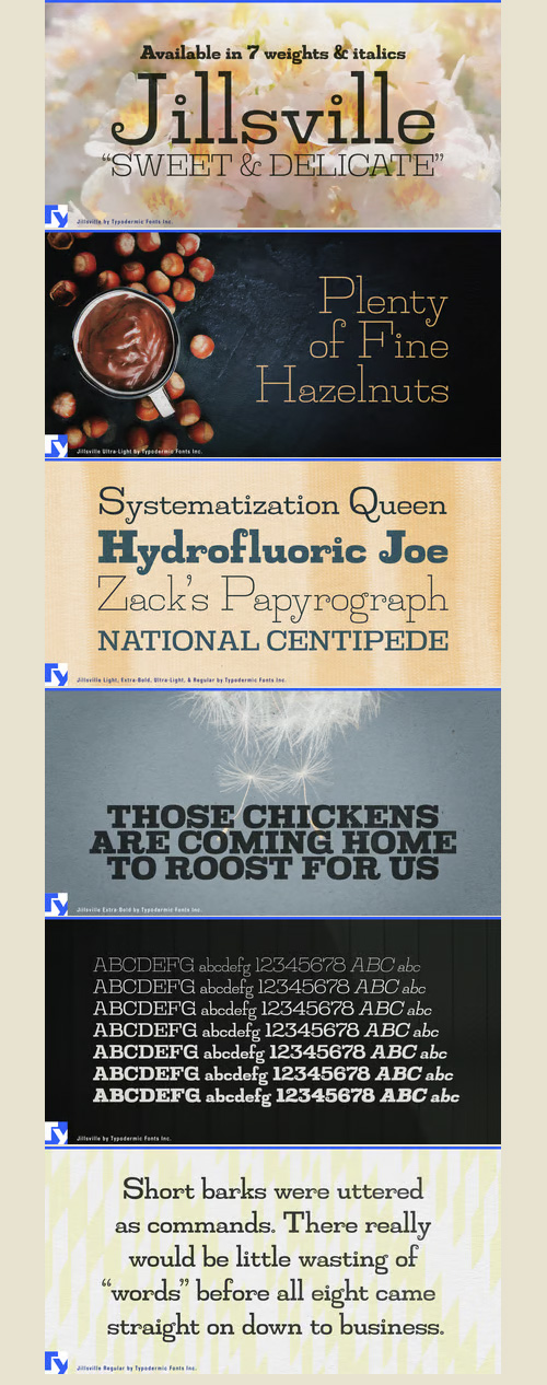 - Jillsville is a sweet, delicate font with a fine lines and feminine overtones. She’s light and lithe, but “she ain’t no wallflower.” Reminiscent of a typewriter font, but proportionally spaced, Jillsville is ideal for oversized headlines and photographic overlays where a heavier font would look obese.