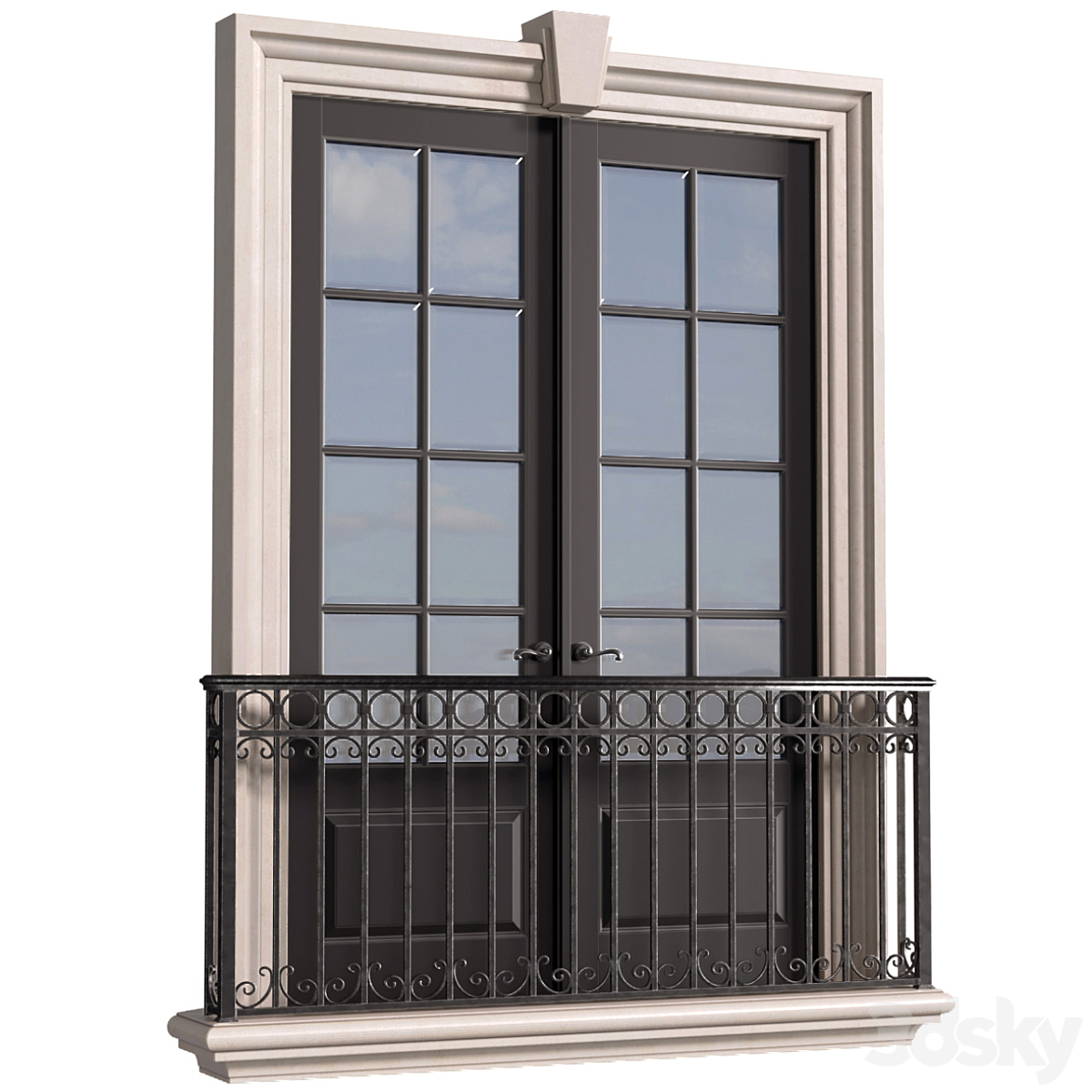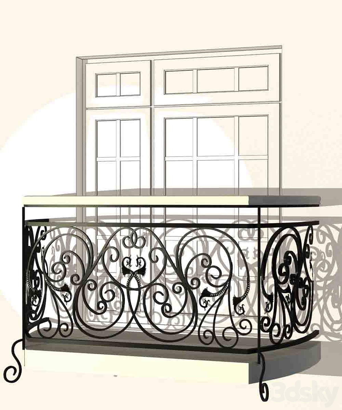 Classical front window with a French balcony.Classical Forged Fence. frame Window