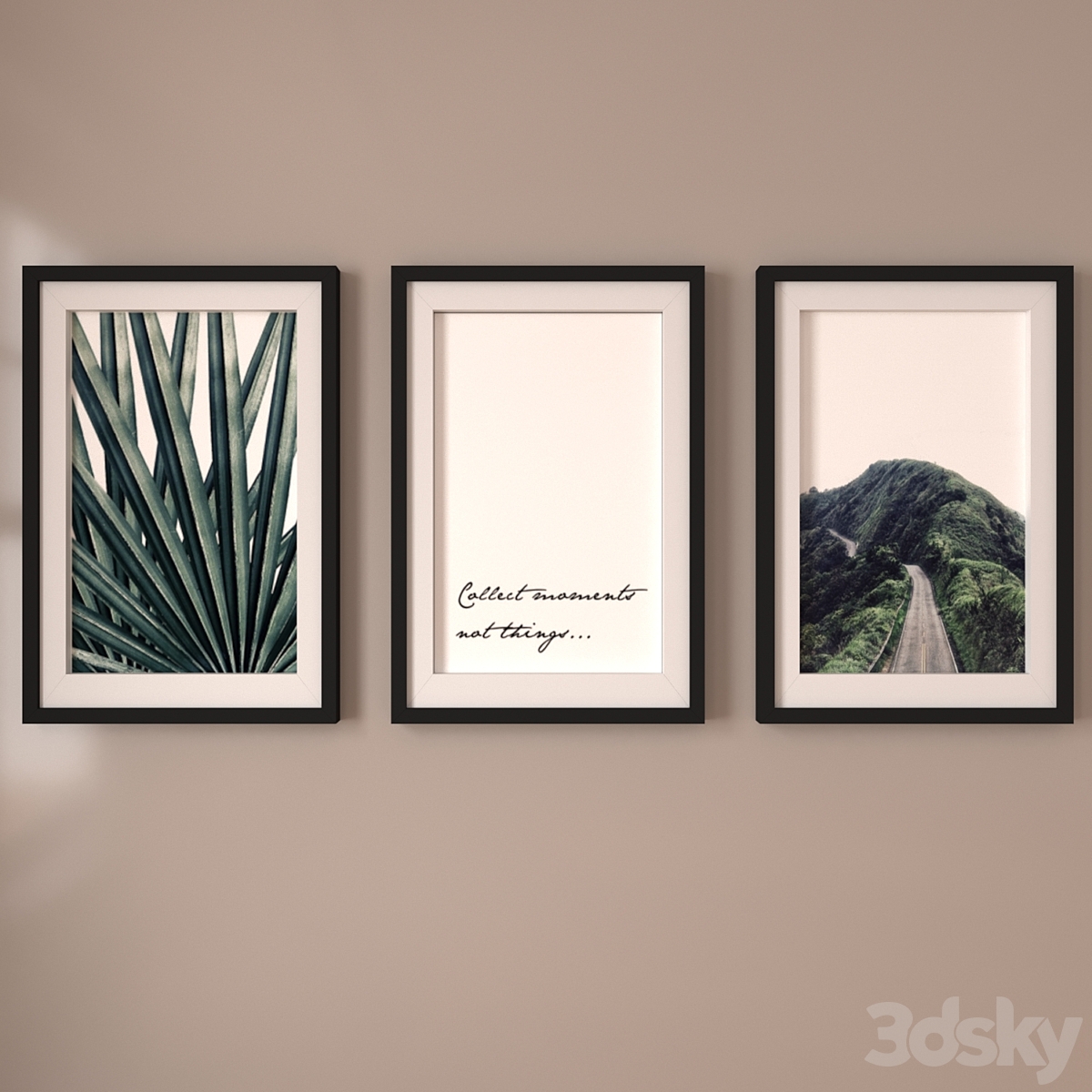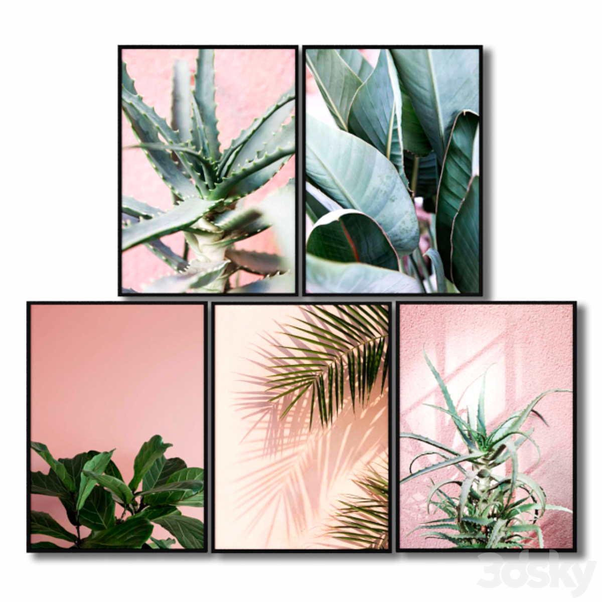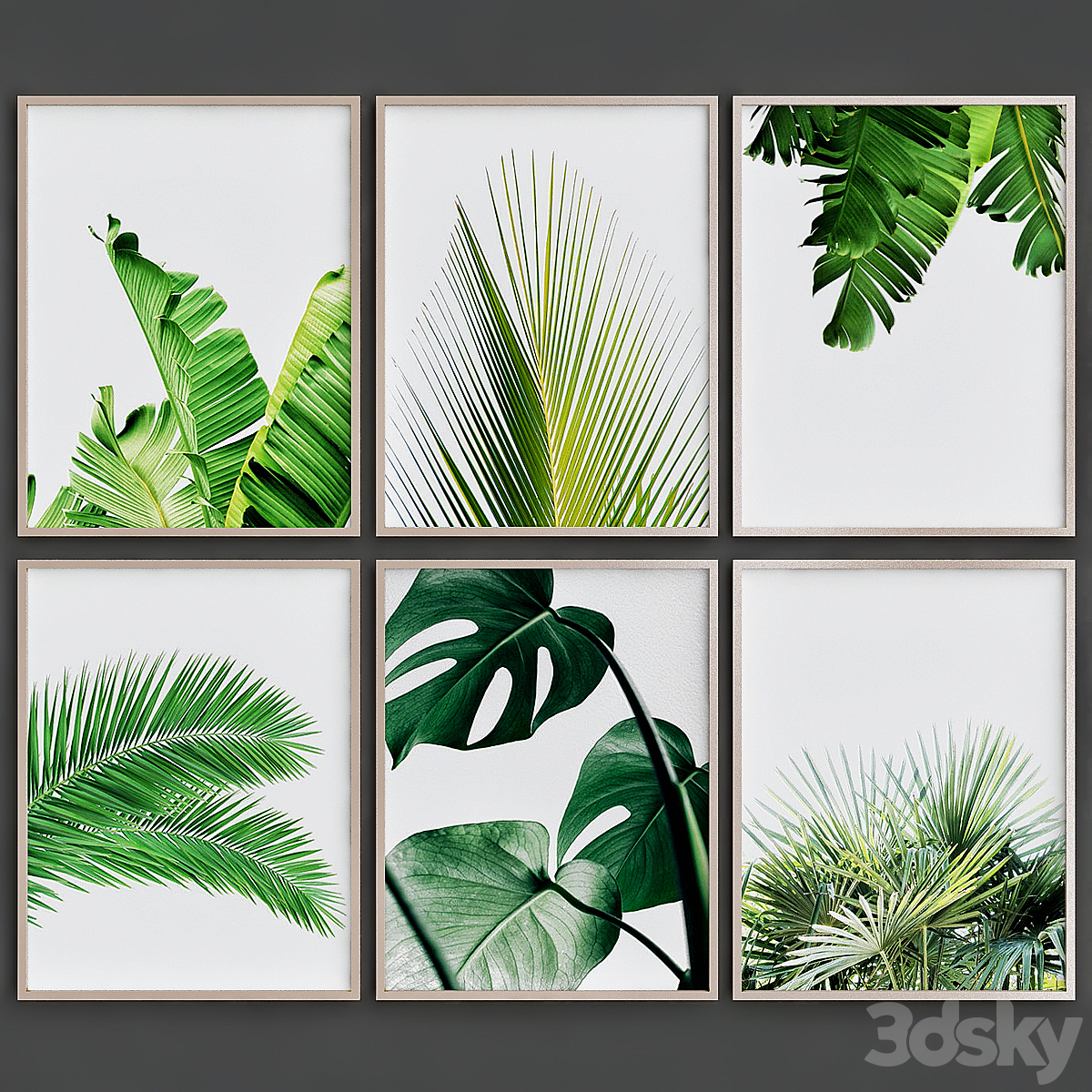 A set of posters with leaves and palm trees.