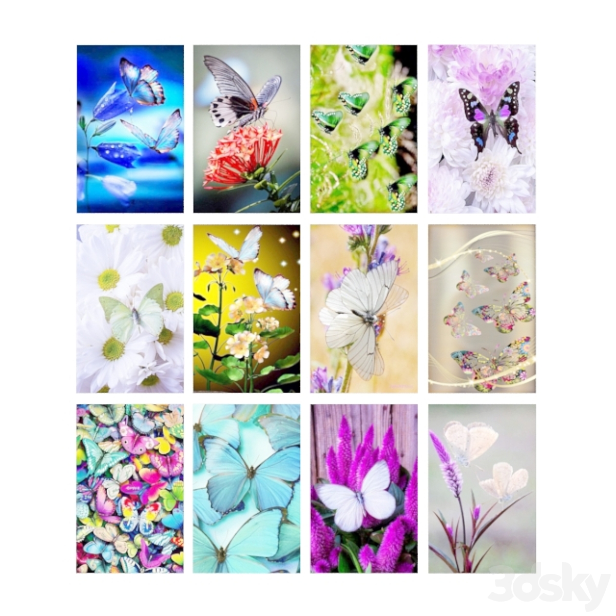 Paintings with butterflies and flowers.