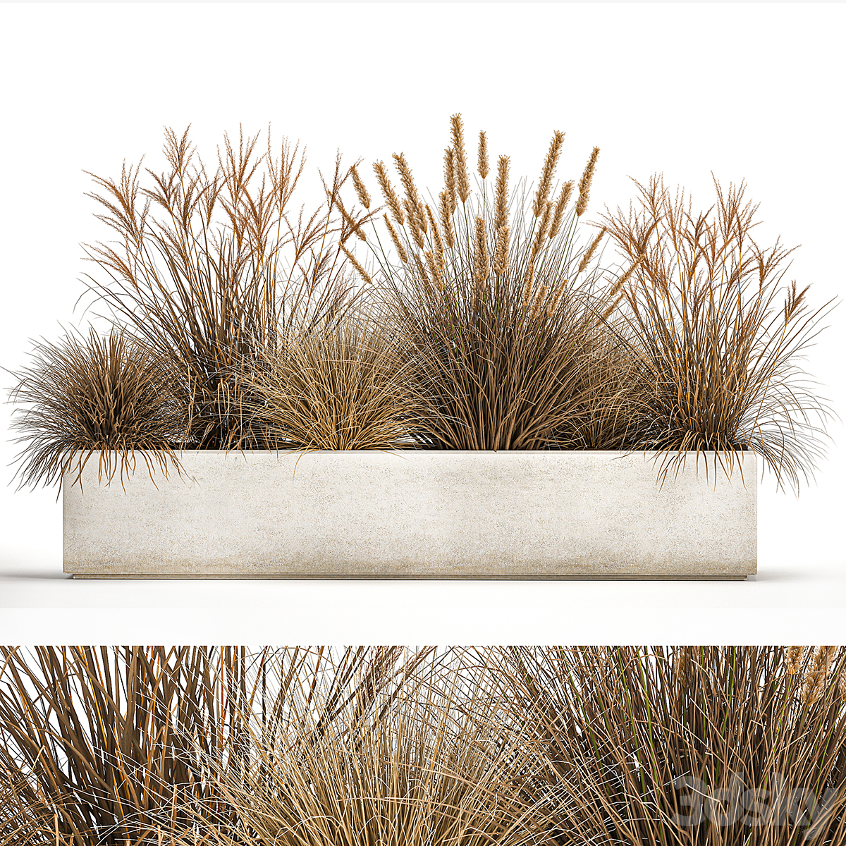 Bench flowerbed for the urban environment in a concrete flowerpot with bushes of reeds and dried flowers, dry grass. 1142.