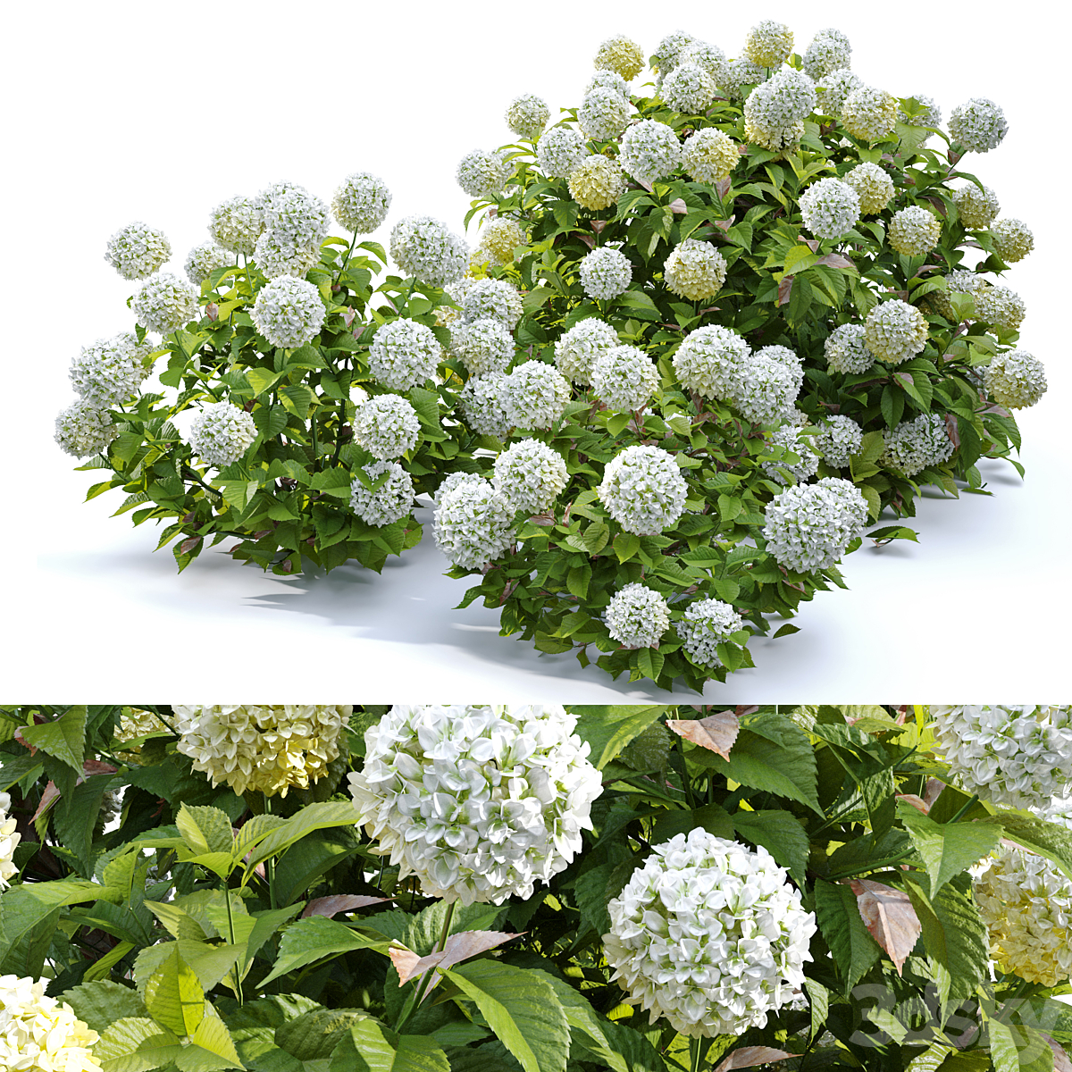 Beautiful bush white hydrangea with flowers for the garden, hedge. Plant set 1185