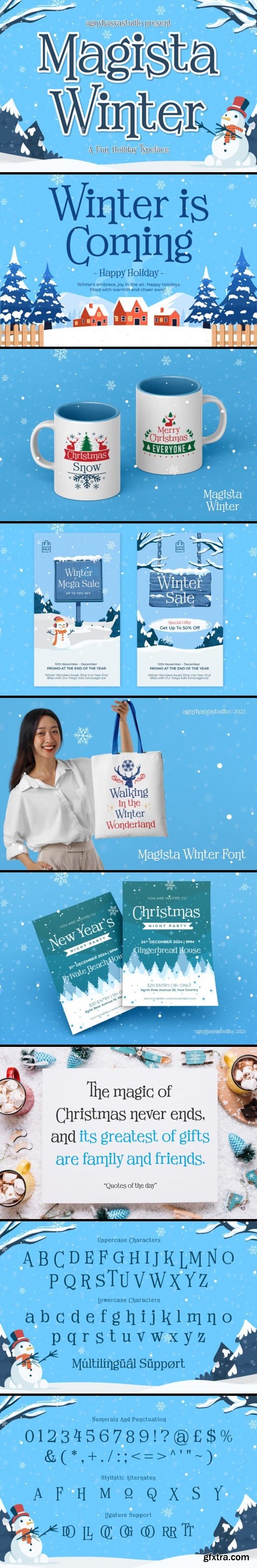 **Magista Winter** Is a Fun Holiday Typeface With a Concept of the End of the Year Events Such as Christmas, New Year, and Winter. It Comes in 2 (Two) Styles (Regular and slant) and Is Created With Some Alternate and Ligatures.Perfect for Your Design Projects Like Advertising, Branding, Posters, Sale Signs, Product Designs, Special Events, Book Covers, Cards, Merchandise, Labels, Product Packaging, and More.