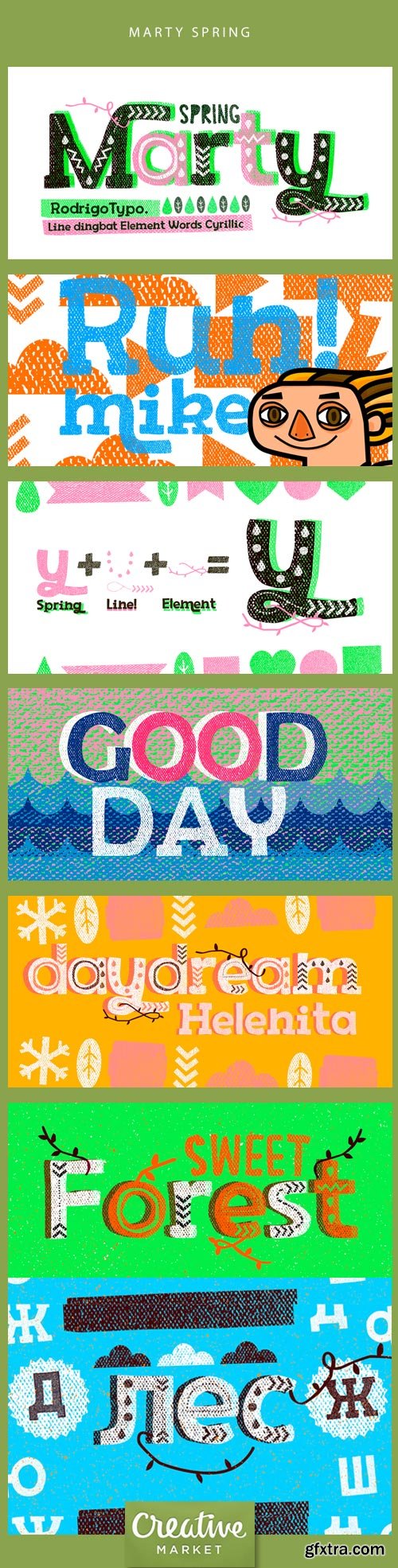 Variants of Marty, to generate many more entertaining titles, playing with shapes, lines, also contains the Cyrillic alphabet was created with the intention of making a more visually friendly title, this typeface contains: