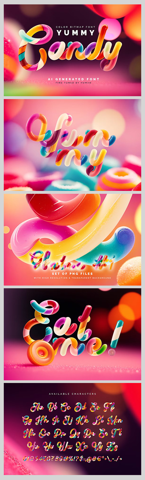 - Presenting a sweet and tasty color font named Yummy Candy. This font was made using an amazing and trending nowadays generative ai technology. First of all, it’s a color bitmap OpenType-SVG font that can be used as a usual OTF font. The resolution of a capital letters in OTF file is roughly 600 px height. An included PNG files with transparent background has around 3500 px height. Please consider that only the English language and basic punctuation are available, please check out the screenshot with all existing characters. Also a fancy blurred background images are included.