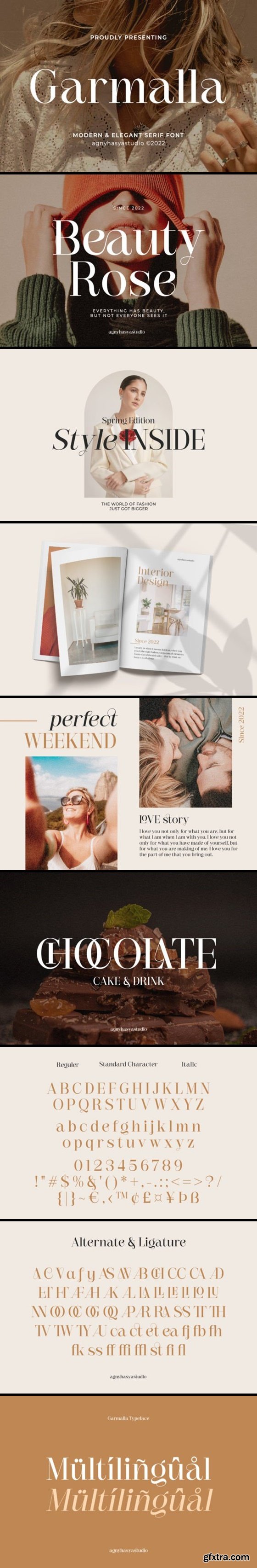 *Garmalla* is a Modern and elegant Display Serif Typeface Font created with glyph variations like alternates and ligatures. Combine it and make your perfect typography design! This font is PUA encoded which means you can access all of the amazing glyphs and ligatures with ease!