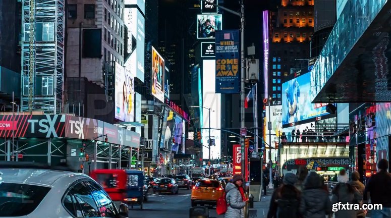 This time-lapse footage showcases the famous New York City streets of Times Square at night, with the LED billboards aglow with advertisements for products, upcoming movies and theater shows.