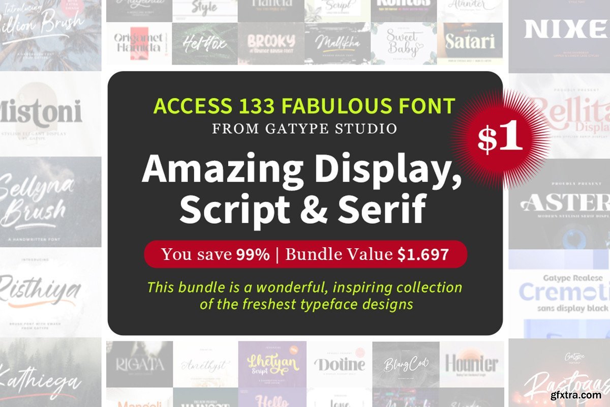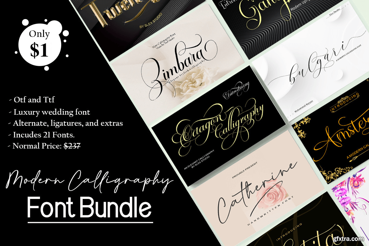 Display and script font collection, get 74 fonts at a super low price of just $1! Purchased separately these fonts are worth $892. This bundle includes a varied range of font styles with hundreds of glyphs, alternates, ligatures, and international language support.