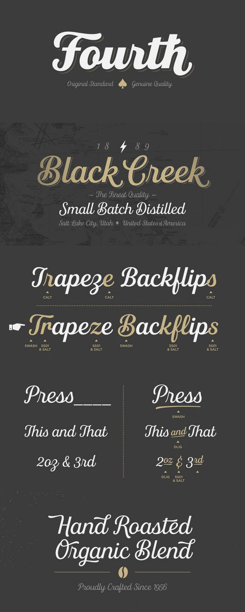 - Fourth is a contemporary roundhand script with a classic feel. It draws inspiration from classic Americana – baseball scripts, sign painting and branding. The family consists of seven weights with ornament extras for good variety in layout and logo development. The forms are rational and refined for consistency and legibility. Contextual alternates are included for smooth initial and ending forms. Stylistic alternates are available for the commonly substituted forms; s, r, l, f, k, and z. Fourth also features Swash capitals, swash lowercase, underlines and catchwords for custom styling.