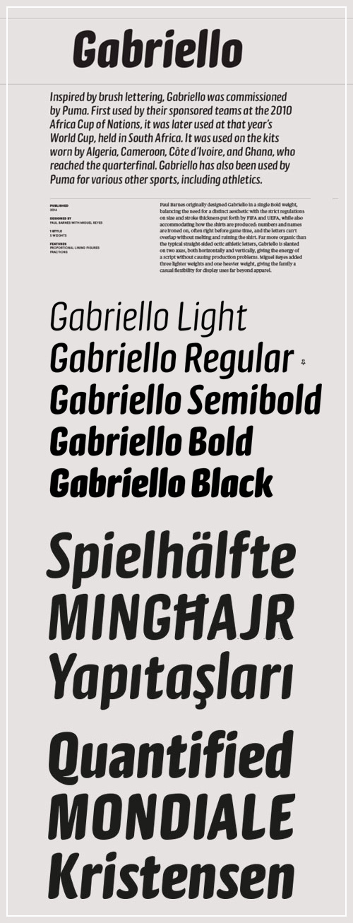 - Inspired by brush lettering, Gabriello was commissioned by Puma. First used by their sponsored teams at the 2010 Africa Cup of Nations, it was later used at that year’s World Cup, held in South Africa. It was used on the kits worn by Algeria, Cameroon, Côte d’Ivoire, and Ghana, who reached the quarterfinal. Gabriello has also been used by Puma for various other sports, including athletics.