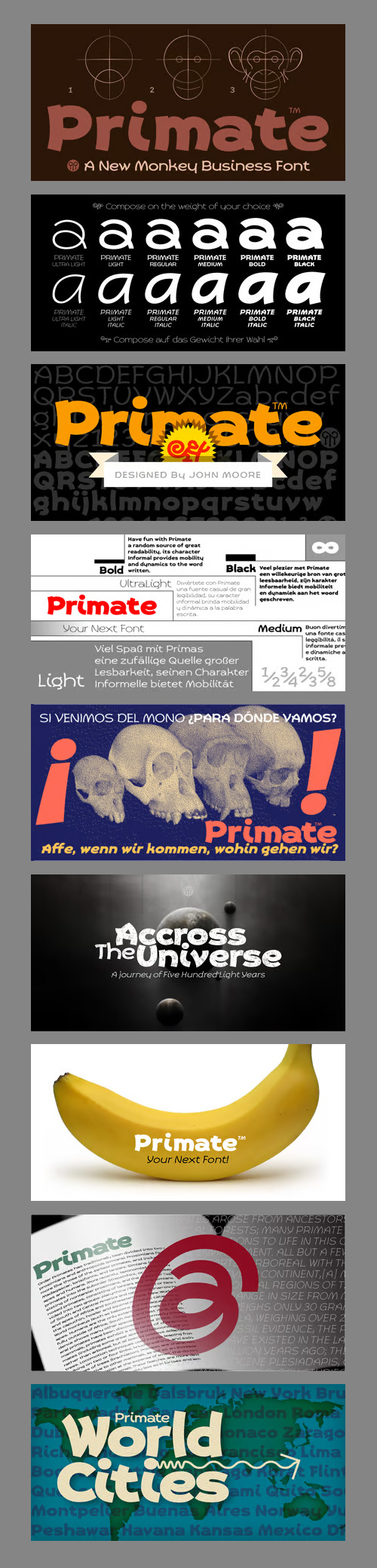 - Primate is a typeface family that works both as a display font for reading, casual and informal as it approaches the forms of nature, hence the name Primate. Primate’s family comes in a full range of weights, from the thin Ultra Light to Heavy Black, all weights are also presented in italics and all have ornaments. Primate is a natural and fun to compose texts, giving the design work of a contemporary look.