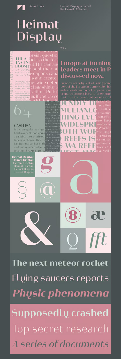 - Heimat Display is a typeface family designed for contemporary typography, especially for use in headlines and on posters, but also for reading purposes. It combines an idiosyncratic appearance with the feeling of a grid-based letter construction of the late 20s. Since the design might be too extreme for some applications, Heimat Display’s character set provides different alphabets, the regular one plus alternate designs that comes across as less suspenseful. Heimat Display [873 glyphs] comes in 72 styles and contains extra sets of alternate glyphs, many ligatures, lining figures [proportionally spaced and monospaced], hanging figures [proportionally spaced and monospaced], positive and negative circled figures for upper and lower case, superior and inferior, fractions, extensive language support and many more OpenType features.