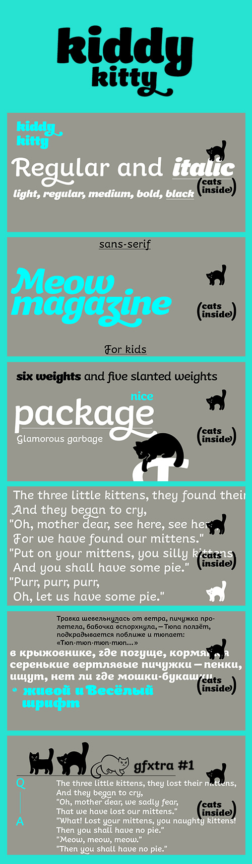 - Kiddy Kitty is a soft and friendly sans-serif type family which consists of 6 upright italic and 5 italic weights. It supports Western and CE Latin and Cyrillic, and it also has some ligatures and swashes and 16 carefully drawn cat dingbats in each font. Kiddy Kitty is good for greeting cards, children’s books and package design. It is designed by Vasily Biryukov with some support of Alexandra Korolkova.