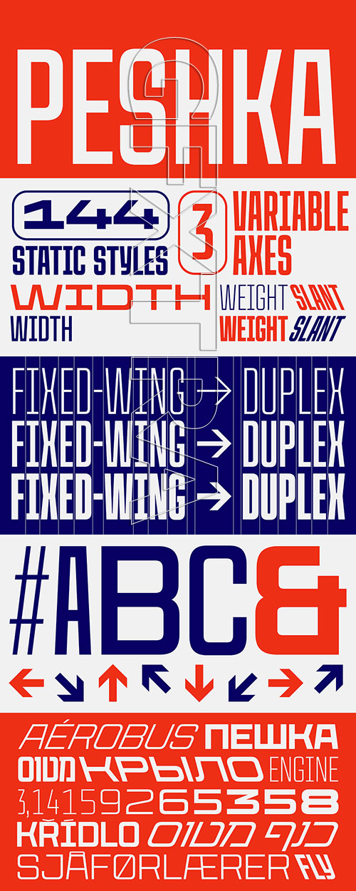 • CoFo Peshka is based on examples of industrial lettering from the early 20th сentury, and yet the design is not limited to being a pure revival. Seemingly square, blocky and brutal, CoFo Peshka nevertheless embodies familiarity and friendliness. We pushed the initial idea to a variety of extremes, added extensive language and character support and developed it as a variable typeface from the very start.