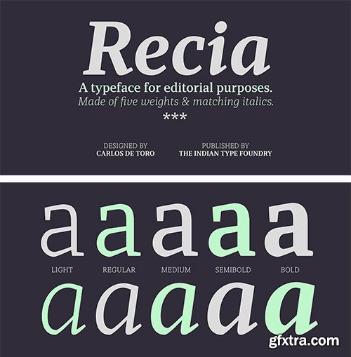 - Recia is Carlos De Toro’s debut typeface with ITF. Recia is a contemporary-style serif. The family comes in 10 styles, and its five Italic fonts are ‘true-italic’ designs, which feature a cursive-structure in the letters. Its x-height is pretty high and the characters are slightly condensed, with strokes that are rather low-contrast. In the lighter weights, hardly any stroke contrast is visible between the thick and thin portions of the letters, but in the Bold weights, stroke contrast is clear, but the thinner strokes are still quite chunky. The serifs all take wedge-shapes. Each font contains 516 glyphs, and the character set offers users multiple figure styles via OpenType features. The default numeral versions are proportional oldstyle figures. Recia is optimised for use in running text, particularly in less-than-optimal printing environments were sturdy letterforms are needed.