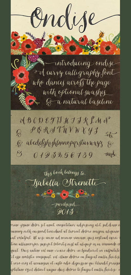- Ondise is a curvy and warm hand-lettered calligraphy script with a natural, dancing baseline. This Opentype font was created with a pointed pen & ink, and includes six different ampersands as well as a swash feature that automatically substitutes beginning & end of word letters. To enable alternate ampersands, simply turn on the contextual alternates feature and type &1, &2, &3, etc. Opentype coding automatically substitutes the new ‘and’.