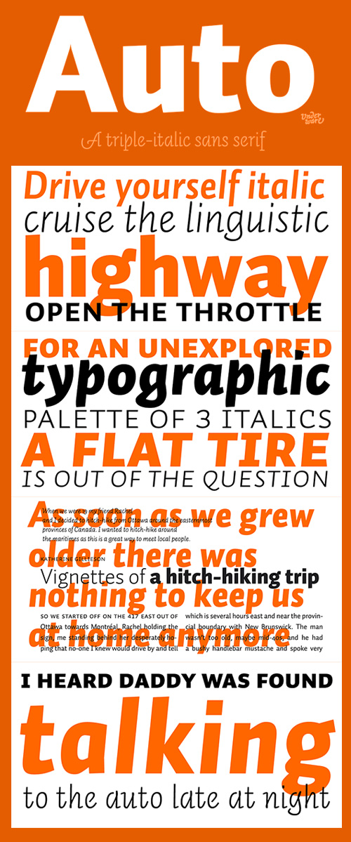 - Auto is a sans serif typeface which has three different models of italics, each with its own flavour.The complete font family consists of 3 x 24 fonts: Auto 1, whose italic is straightforward and restrained; Auto 2, with a personal and friendly italic; and Auto 3 with provocative, almost upright italics, with open counters and strategically placed serifs, loops and swashes.With its three italics, Auto creates a new typographic palette, allowing the user to drive through unknown typographic and linguistic possibilities. Also, because of its four weights and the three different figure styles, it’s a vehicle equipped for many roads of typography.Take a cruise, and let this typeface carry you to business or leisure.