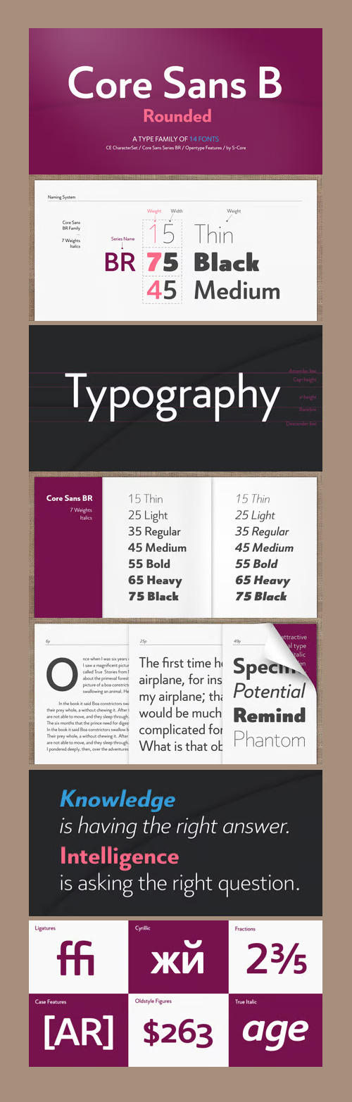 - The Core Sans BR Family is a part of the Core Sans Series, such as N, NR, N SC, M, E, A, D, G, R and B. The Core Sans BR Family is designed with rounded stroke endings for visual comfort. This family has very small x-heights and large ascenders(descenders) which give an elegant feeling in body text. It is a sans-serif family but it’s structure is similar to serif fonts, so you can make paragraph beautiful with this font family. It is very legible and readable even in small size because of its open counters and distinctive shapes. This font family consists of 7 weights (Thin, Light, Regular, Medium, Bold, Heavy, Black) and Italics for each format. Core Sans BR supports complete Basic Latin, Cyrillic, Central European, Turkish, Baltic character sets. Each font includes proportional figures, tabular figures, oldstyle figures, numerators, denominators, superscript, scientific inferiors, subscript, fractions and case features. We highly recommend it for use in books, web pages, screen displays, and so on.